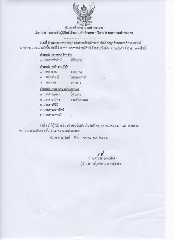 ประกาศรายชื่อผูู้มีสิทธิ์สอบเพื่อจ้างเหมาบริการ โรงพยาบาลท่าสองยาง