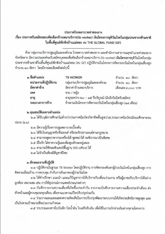 ประกาศโรงพยาบาลท่าสองยาง รับสมัครสอบคัดเลือกจ้างเหมาบริการ (tb worker) เงินโครงการยุติวัณโรคในกลุ่มประชาการข้ามชาติ ในพื้นที่ศูนย์พักพิงบ้านแม่หละ งบ THE GLOBAL FUND (GF)