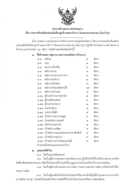 เรื่อง รพ.ท่าสองยาง เปิดรับสมัครคัดเลือกลูกจ้างเหมาบริการ เงินนอกงบประมาณ จำนวน 21 ตำแหน่ง 61 อัตรา