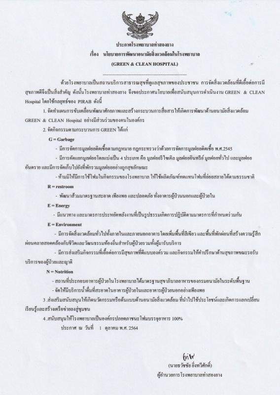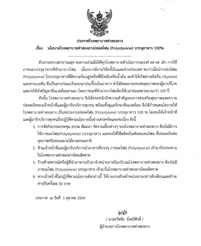 นโยบายโรงพยาบาลท่าสองยางปลอดโฟม บรรจุอาหาร 100%