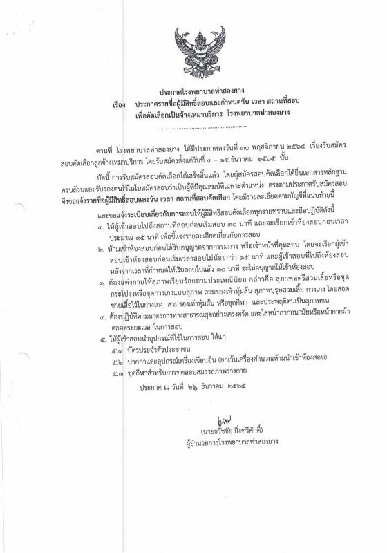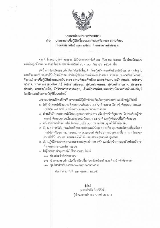 ประกาศรายชื่อผู้มีสิทธิ์สอบและกำหนดวัน เวลา สถานที่สอบ เพื่อคัดเลือกเป็นจ้างเหมาบริการ โรงพยาบาลท่าสองยาง