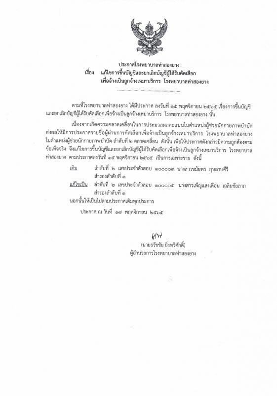 แก้ไขการขึ้นบัญชีและยกเลิกบัญชีผู้ได้รับคัดเลือกเพื่อจ้างเป็นลูกจ้างเหมาบริการ โรงพยาบาลท่าสองยาง