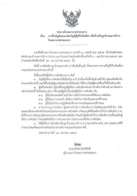 ประกาศการขึ้นบัญชีและยกเลิกบัญชีผู้ได้รับคัดเลือก เพื่อจ้างเป็นลูกจ้างเหมาบริการโรงพยาบาลท่าสองยาง