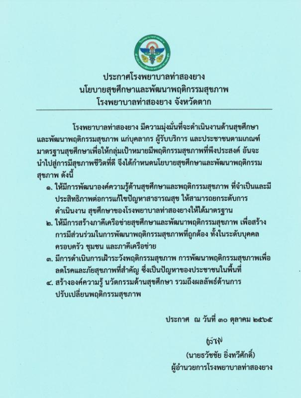 นโยบายสุขศึกษาและพัฒนาพฤติกรรมสุขภาพโรงพยาบาลท่าสองยาง
